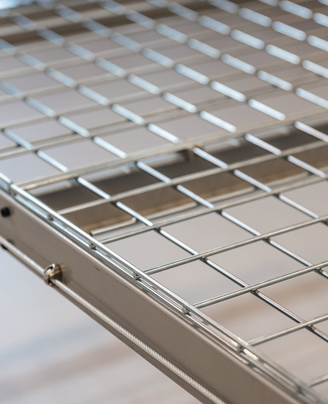 Our decking panels are made from heavy duty 4-gauge (5.5 mm diameter) welded wire mesh that has been hot-dip galvanized to help protect against corrosion and provide rust resistance. The wires are spaced evenly to create 3" x 3" clear opening. The rigid construction make them extremely sturdy. They won't sag or bend like many of our competitor's platforms. The decking panels are supported by durable 1.8 mm thick perimeter support beams and 1.5mm thick interior beams. All beams have a rust-resistant powder-coated finish.