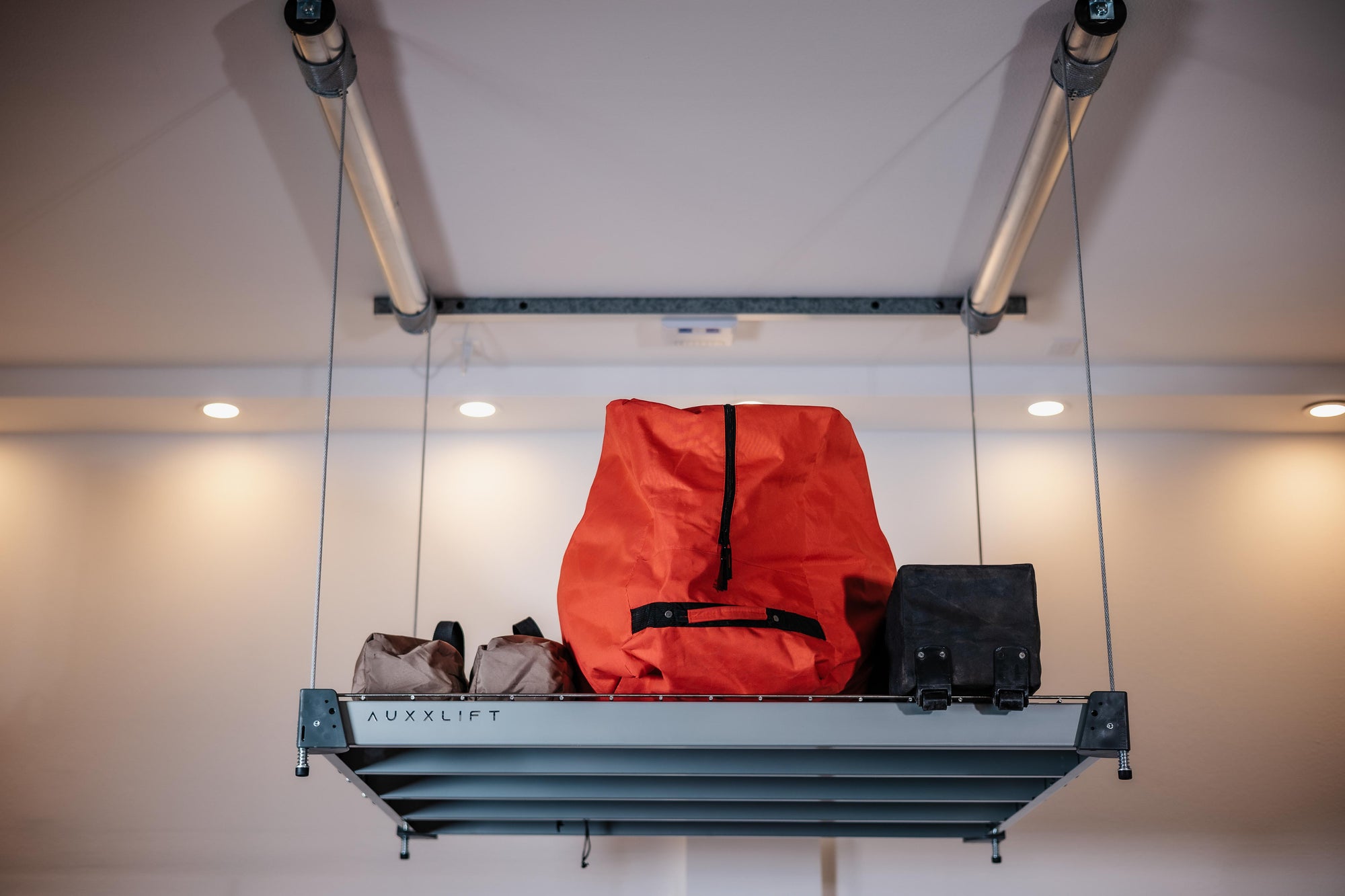 Our motorized lifting platform maximizes the overhead storage potential of your garage. The Auxx-Lift garage storage solution comes in various sizes, colors, and lifting capacities, allowing you to customize with our products to fit your storage needs.